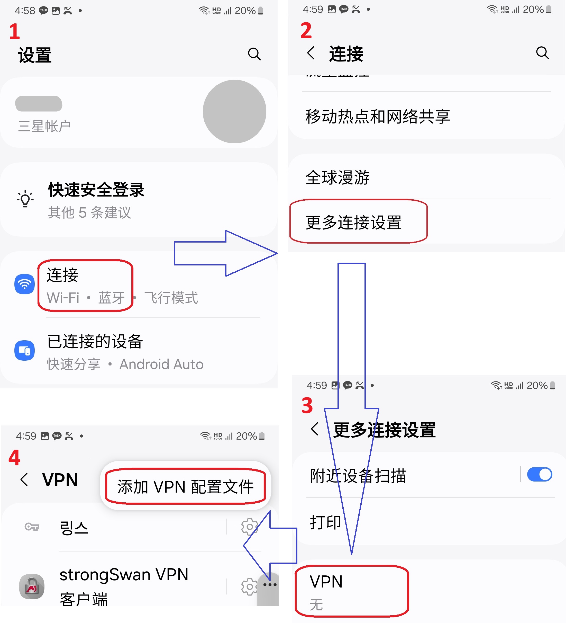 ① "设置" ⇒ "连接"(更多连接设置) ⇒ "其他连接设置" ⇒ "VPN" ⇒ "添加VPN配置文件"