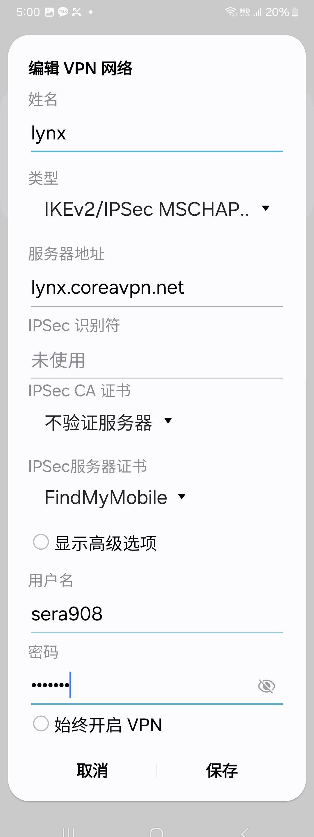 安卓手机(三星、国产手机等) IKEv2 手动设置