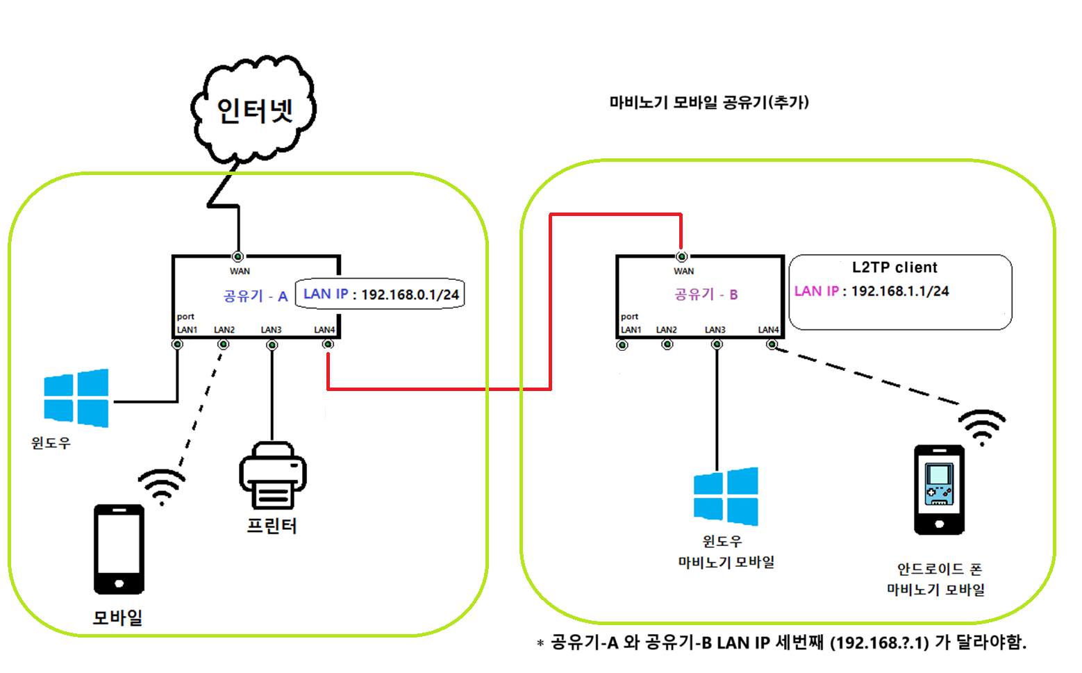 ("°øÀ¯±â-A"°¡ 192.168.0.1 À̶ó¸é "°øÀ¯±â-B"ÀÇ LAN IP¸¦ 192.168.11.1 ·Î º¯°æ)
